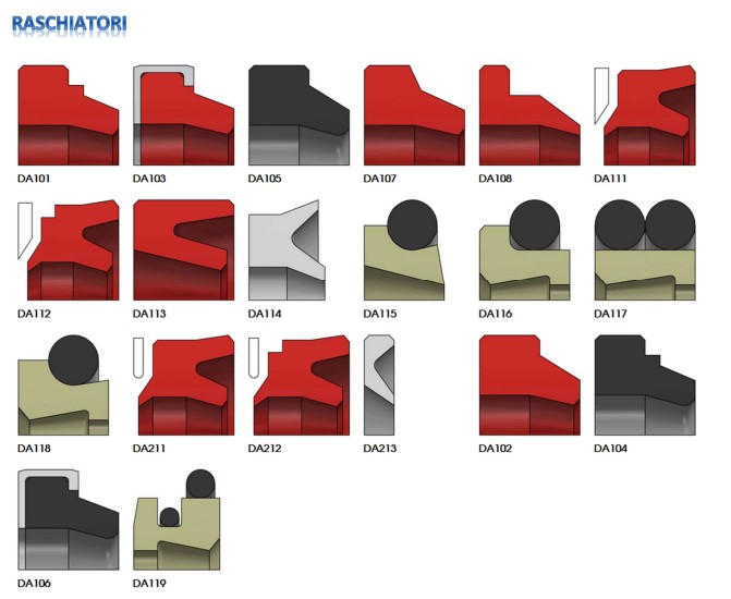 Possiamo avere: raschiatori in gomma, raschiatori in poliuretano, raschiatori con elemento metallico interno od esterno, raschiatori a semplice o doppio effetto e raschiatori in PTFE accoppiati ad uno o due OR